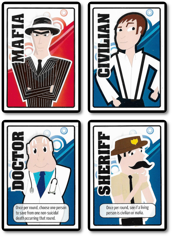 Included with the deck are additional Professions that give the owning player a special ability that can be used during the game. These go beyond the standard “Sheriff” and “Doctor” Professions. For example, the “Thief” will allow players to steal cards from an opponent, and the “Godfather” can appear to be a “legit businessman” if the “Sheriff” investigates them.