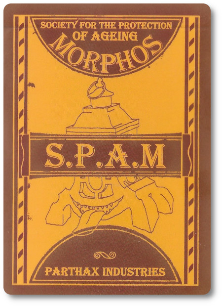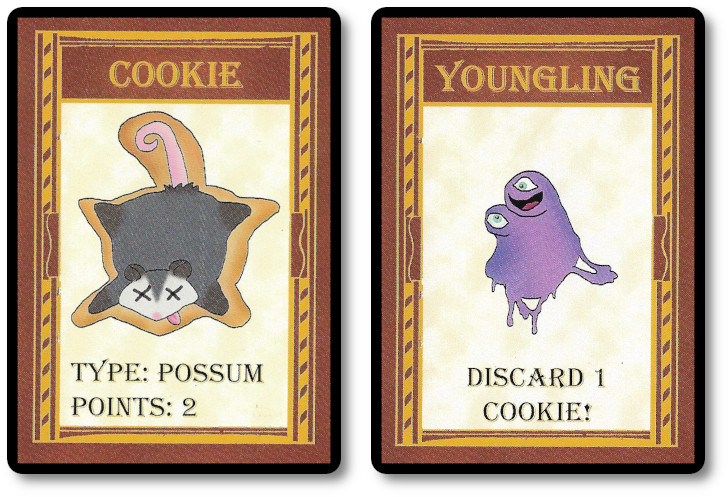 Society for the Protection of Aging Morphos (aptly given the acronym S.P.A.M.), designed by Phil Houlding, Mark Kilburn, Mercedes Palmer-Higgins, and published by Parthax Industries, is comprised of 46 cards. The cards are as thick and as durable as your standard playing card. Illustrations by Mercedes Palmer-Higgins depict colorful and truly bizarre creatures and cookies that look like roadkill.