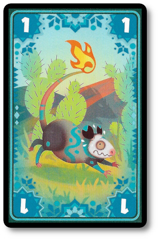 When all the players pass, the player who played the last card wins the round. This player takes the top-most card from the Iguana pile and places it face-down in front of them, placing their Opposum card that won the hand on top of it. This is the player’s “fire stack.” If an opponent has a fire stack that shows the same Possume card value, the player may steal that opponent’s fire stack.