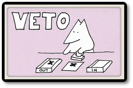 If a player has a “Veto” card won during a previous round, they may use it now, but only if they have not passed. When the “Veto” card is played, it and the current card being bid on are discarded. All players return their counters, and a new card is flipped over. Every player can now bid again, regardless of whether they passed during the current round.