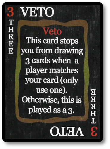 Once a player plays their card, their turn is over, and the next player takes their turn, playing to the discard pile. However, if the next player in the turn order plays a card of the same value as the previous player, the previous player must draw 3 cards from the draw deck and place them in their hand. Unless they have a Veto card, which excuses them from the penalty.