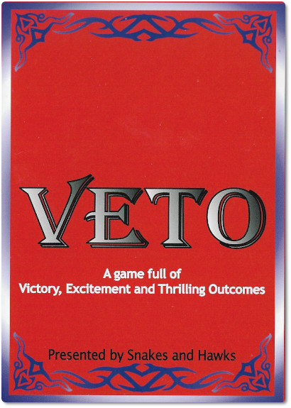 The ability to veto something simply means you elect to block whatever someone suggests you should do. In politics, it’s about blocking legislation. In games, it’s about canceling a card. In this game, no votes are taken, but you do have the ability to duck, dodge, and flat-out cancel other players’ cards played against you. The entire goal of the game is to quickly get rid of your cards, but you’ll quickly discover that such a simple objective is no simple feat to pull off.