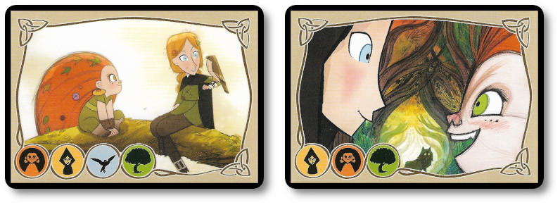 Wolfwalkers: My Story, designed by Maja Milavec and published by Cartoon Saloon, is comprised of 110 cards. The cards are as thick and as durable as your standard playing card. Illustrations are lifted directly from the movie on which the game is based. Which is to say, they are exceptionally well done and bring a great deal to the table – so to speak – when it comes to reinforcing the game’s theme and narrative. Not included with the game, but very handy to have, is a pen or pencil and something to write on to record players’ scores at the end of the game.