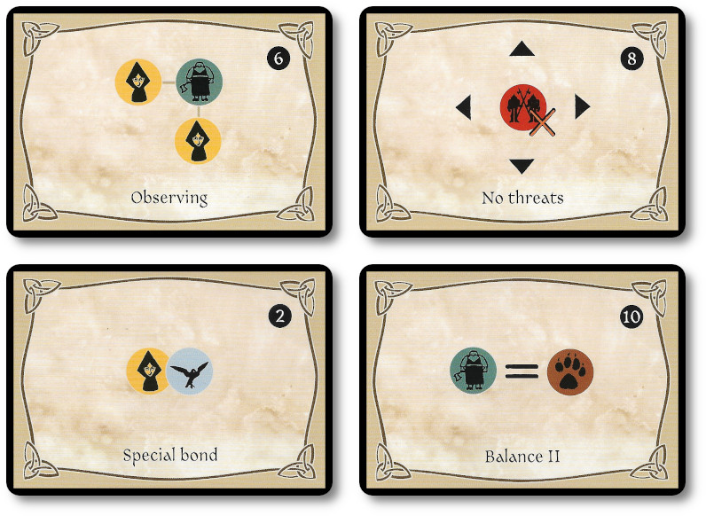 The “objective” side of the card displays one of four goals for the player to achieve. Achievements are based on the icons shown on the “story” side of the cards.
